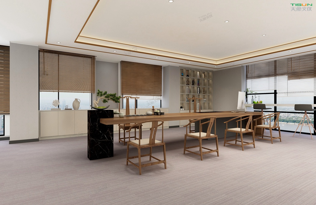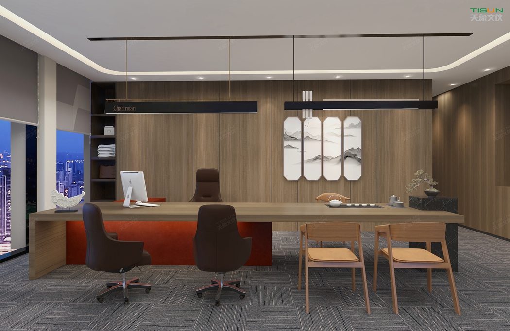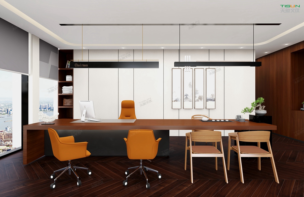 This office furniture is simple in shape, with a small number of turning lines to enrich the connotation of product design. It is matched with the overall customized background wall and bookcase to show the social status and identity of users with a sense of massiness.